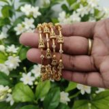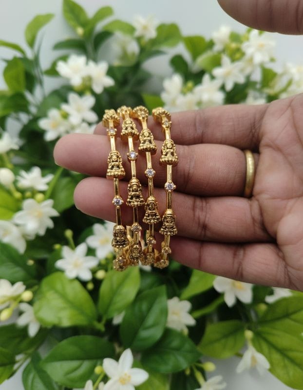 These Traditional Nagshi Bangles are a testament to classic South Indian jewelry art. The broad surface is entirely covered in rich, matte-finish Nagshi (or Nakshi) work, depicting sculpted traditional motifs and figures. The design is punctuated by alternating ruby (white), surrounded by tiny white AD stones for added brilliance. The heavy, ornate appearance makes this pair a magnificent addition to a festive saree or an important family function. These bangles offer the look of solid antique gold craftsmanship at an accessible price.