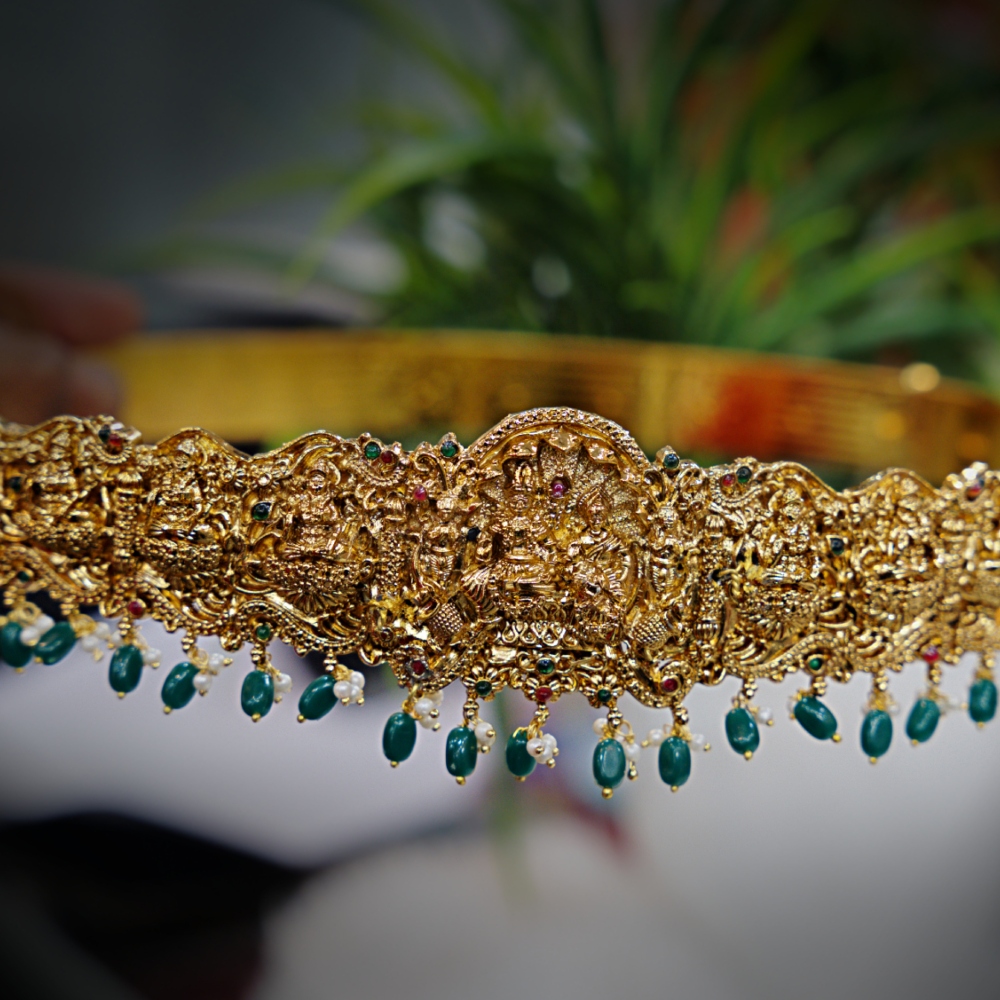 This magnificent Nagshi Vaddanam is designed to provide a rich, traditional accent to your saree or half-saree ensemble. The broad belt is covered edge-to-edge in detailed Nagshi (sculptural) work, featuring traditional figures and intricate filigree in an antique gold-tone finish. The center boasts a beautifully depicted Goddess Lakshmi. The intricate stone setting is complemented by a dense, hanging fringe of dark green beads and tiny pearls, which add graceful movement and classic color to the piece.