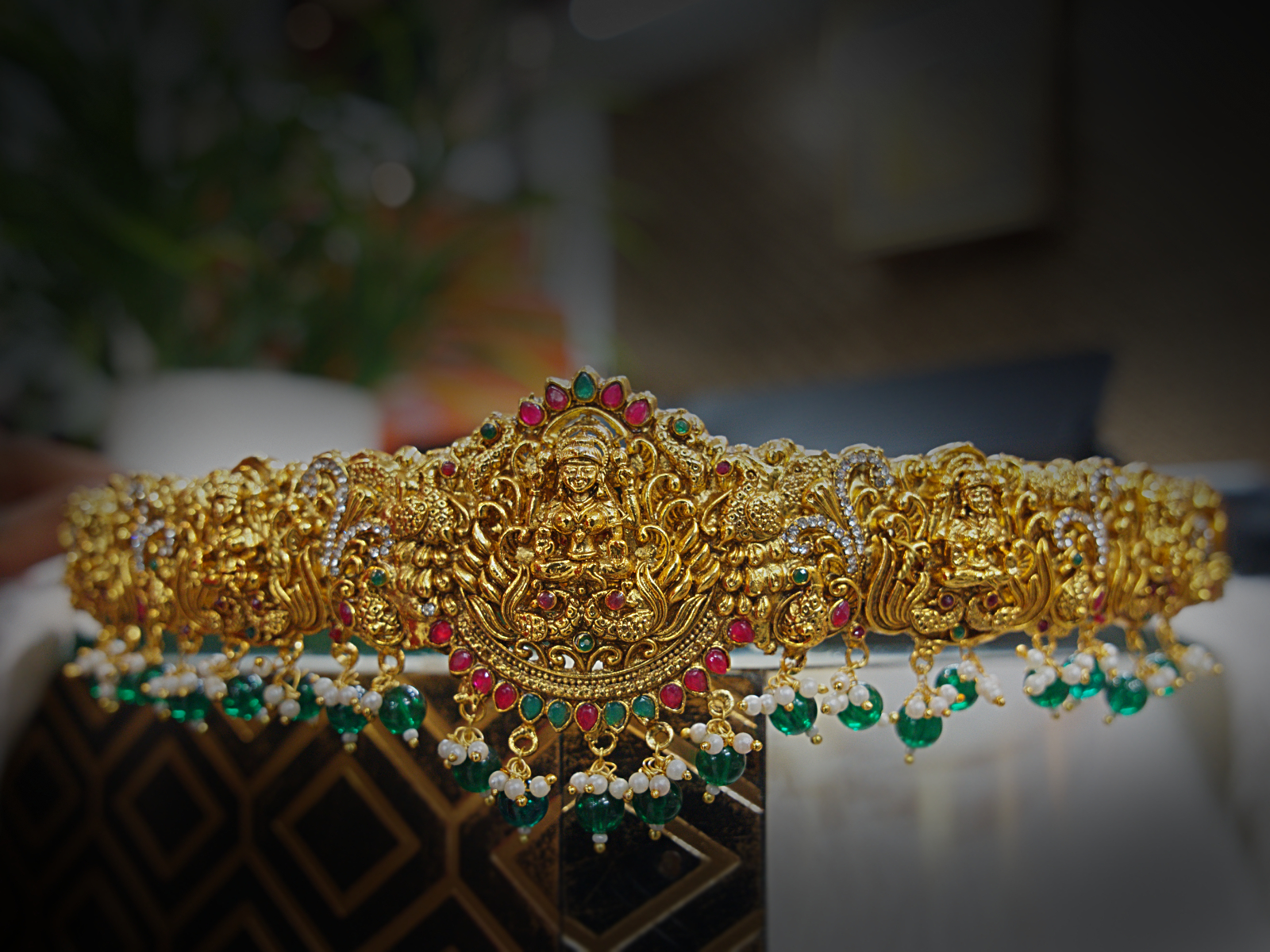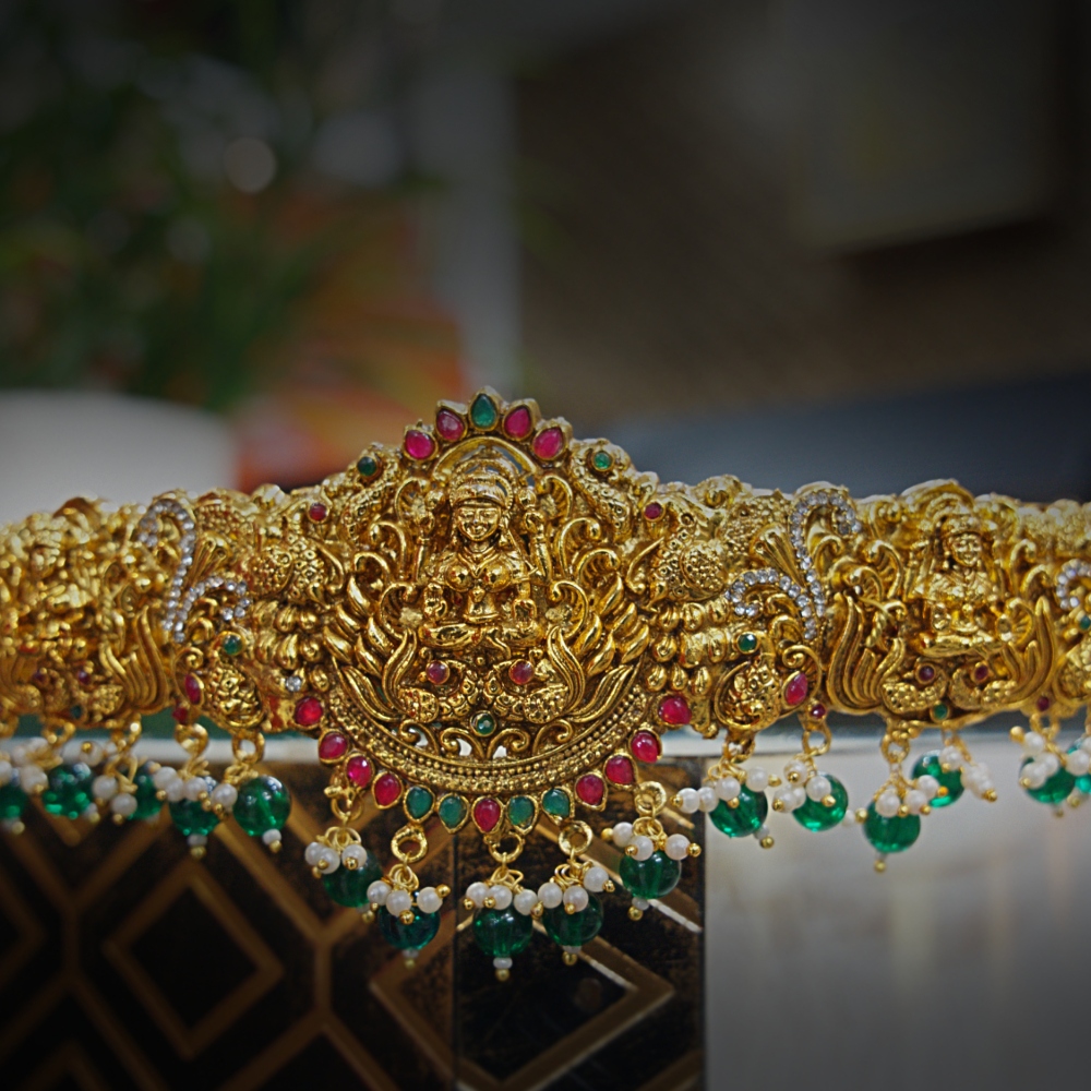 This opulent Nakshi Vaddanam is a truly grand piece for any traditional ensemble. The broad belt is covered in tightly packed Nakshi (sculptural) work, giving it a rich, antique gold finish. The magnificent central motif features Goddess Lakshmi surrounded by filigree and detailed figures. The belt is brightly accented with ruby and emerald kemp stones within the design and features a continuous fringe of deep emerald-green beads and pearls along the bottom edge, adding beautiful movement and color.